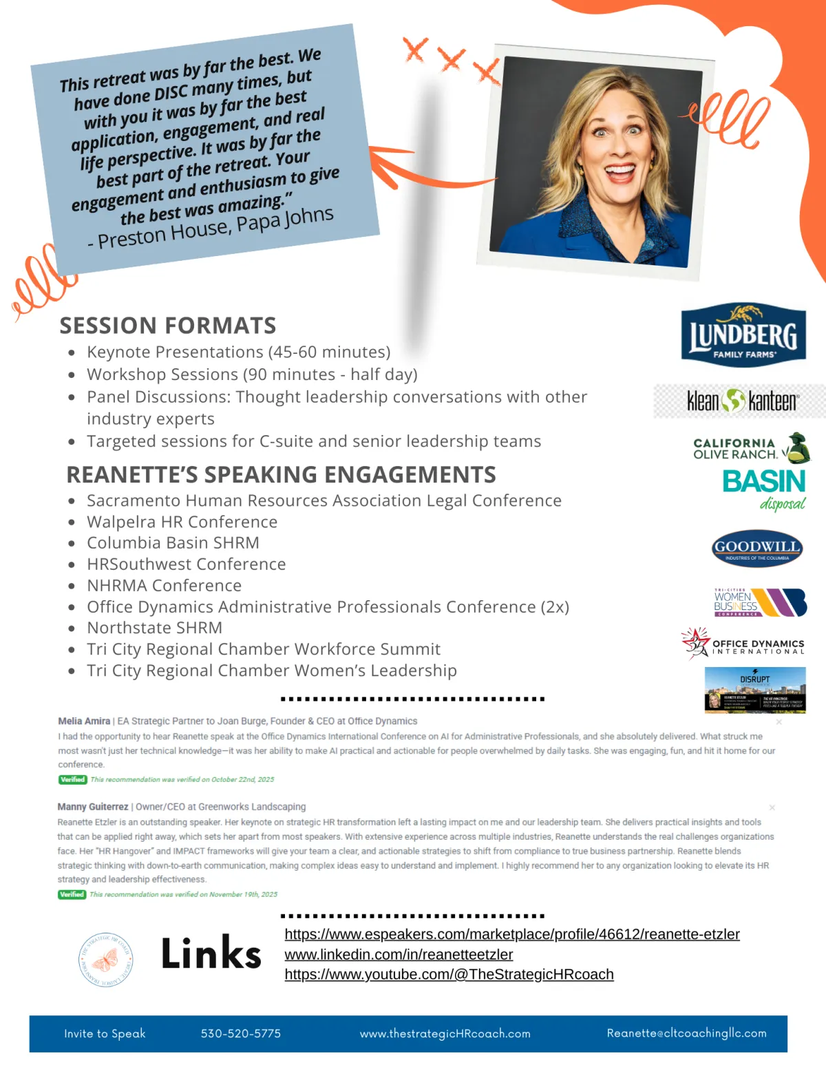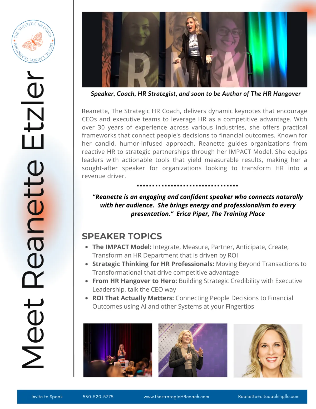 Most speakers target either HR professionals OR executives. Reanette speaks to both simultaneously, creating alignment that drives real organizational change.